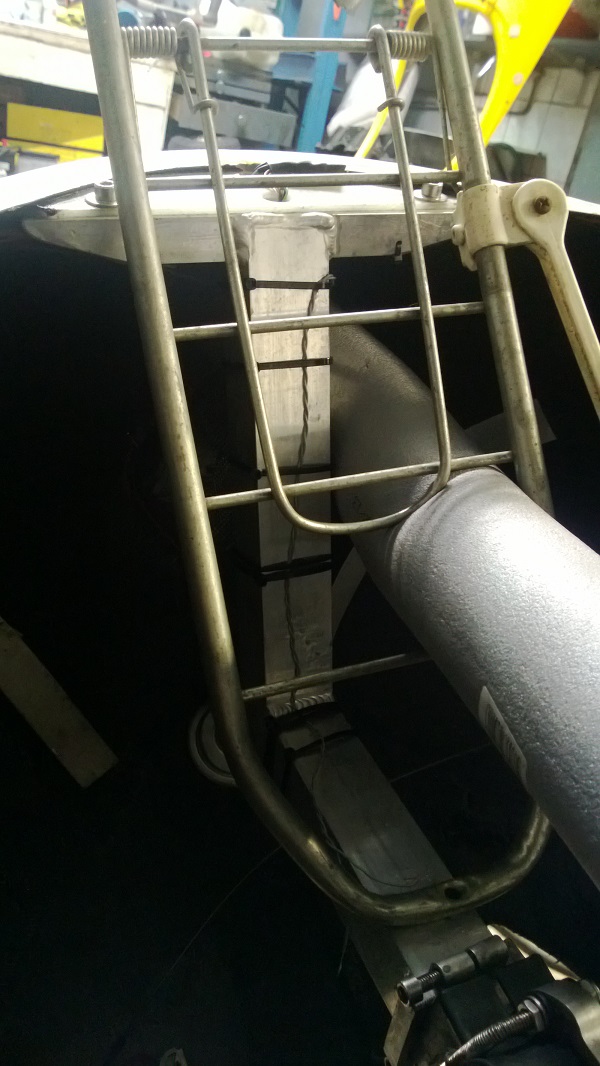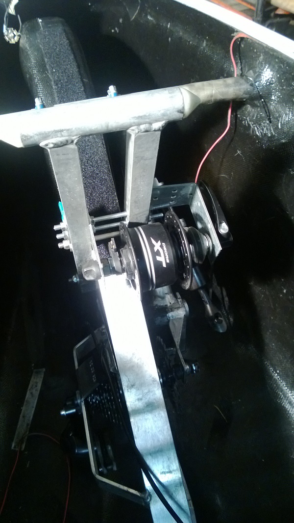 Kaikkea epätoivoista sitä sommittelee ja kokeilee... runko notkuu voimalla polkiessa ja jollain sivutuilla sitä kait voisi hillitä, mutta tämä jää sihen kun on alumiinin juottamiseen soveltuvat vermeet. Kyljet on sen verran heppoista kamaa, että tankoja ei oikein sivullekaan saa tai jos joku kevyt sivukosketus tulee esteeseen niin ne tangot tulisi sitten kyljestä läpi eli ainoa mahdollisuus on tuo rungon levennys keulassa.