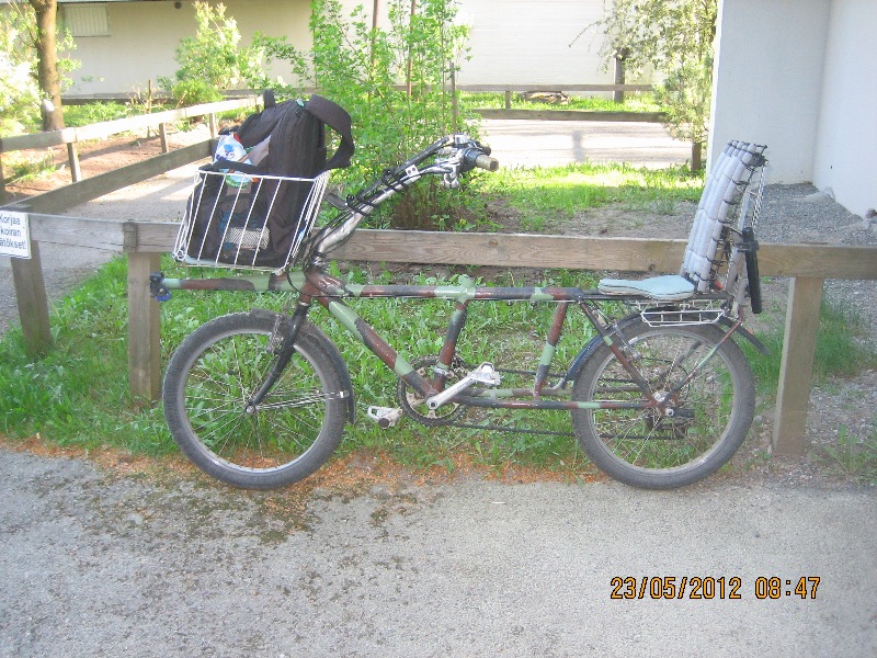 Ranskan foorumilta löyty MBB-tandemi, aikamoinen putkihässäkkä. Tuli vaan mieleen, näinä "naruperäaikoina" - eikö tuommosen tandeminkin vois toteuttaa narukiinnitteisenä? Nivel niskojen väliin ja naru penkin alta penkin alle. Jos tarttee joustoa ni kumia väliin.