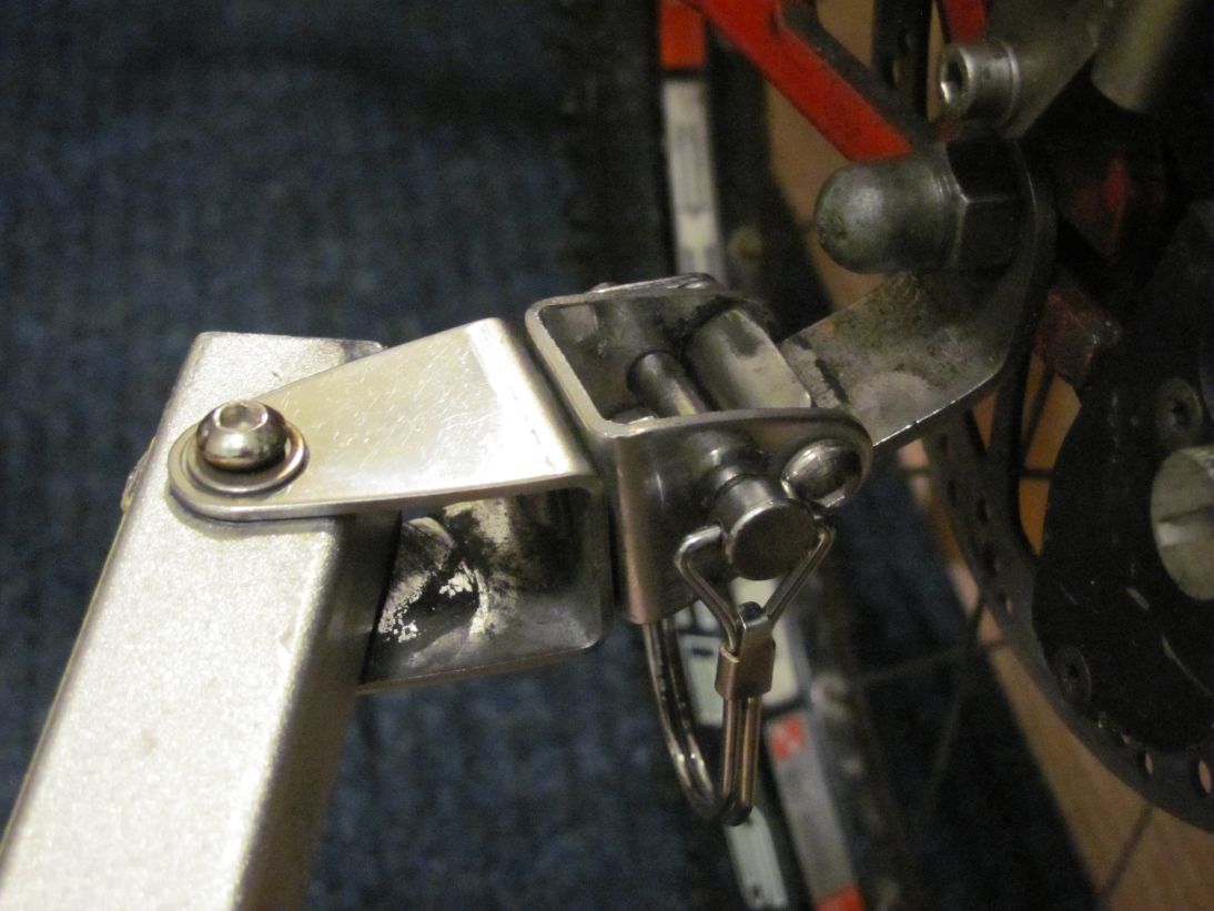 Kuvissa on orginaali kiinnityssysteemi. Se on muuten ihan hyvä ja fiksu, mutta tuon pyörään kiinnitettävän koukun muotoilisin toisin. Se on siis ollut syynä kärryn irtoamiseen. Koukun pää saisi kenties olla hieman pidempi/syvempi ja sen päässä saisi ulkopinnassa olla paksunnos joka estäisi sen ettei kärry sokka paikallaan ollessaan millään pääsisi irti. Itse ajattelin hitsata paksunnokset noihin koukkujen päihin (kärryn mukana tuli kolme koukkua) ja kokeilla toiminnan niin, kunhan vaan saisi aikaiseksi... Paksunnoshan ei saisi tulla liian lähelle sokkaa, sillä muuten se estää pyörän kallistamisen toiseen suuntaan kärryn suhteen.