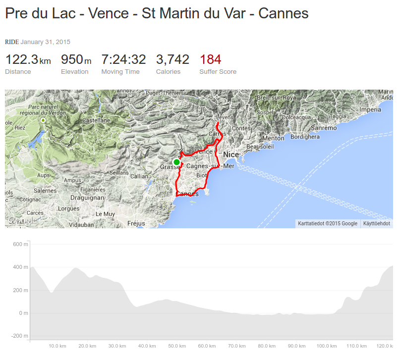 Reilu satasen lenkki, 115 km, tänään ja samalla tuli uusi nopeusennätys trikellä, 70.9 kph. Aikaa paloi 8 tuntia, ajoaikaa tunti vähemmän. Paussiaikaa tuli paljon, kun ajoin Frejus/St Raphael:iin ja siellä kävin kahvilla väärässä rantakuppilassa, lounasaikaan - kaikki tapahtui hitaan periranskalaisen kaavan mukaan, voi hyvänen aika sentään. Strava jälki matkasta: https://www.strava.com/activities/251605388. Alla olevista kuvista huolimatta sää oli vaihteleva, paluumatkalla viimeiset puolitoista tuntia taivaalta tuli vettä, onneksi vain kevyttä uuvuttavaa sadetta.