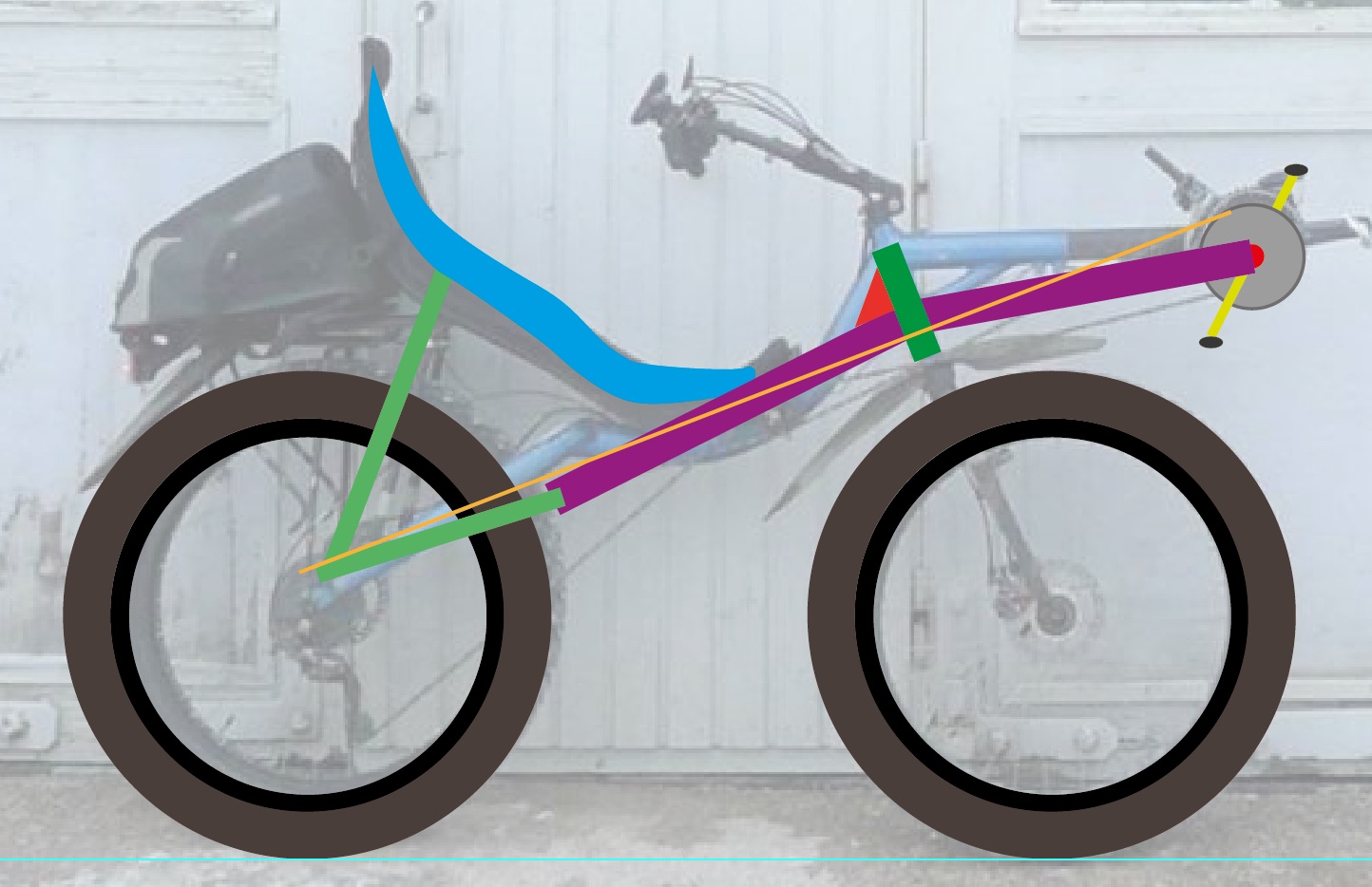 Olen tuota Wackyn kampipuomivauriota miettinyt ja päätynyt siihen työolettamaan, että ketjun suuri kulma puomiin nähden on merkittävä tekijä rungon kuormituksen nousemiseen väsymisvaurioittavalle tasolle. Tällainen muotoilus välttäisi tuon, vaikkei niin olekaan QD-perheen näköinen. Ehdottomasti laittaisin taittpyörän penkin taakse ja suurentaisin, jotta ketjun ja puomin kulma pienenisi ja vähenisi se, videoillakin kuuluva, ketjun sirinä taittopyörää vasten.Tuommosta runkolinjausta aattelin kans. Ehkä vois pari senttiä tiputtaa vielä haarukan kohdalta.