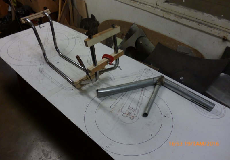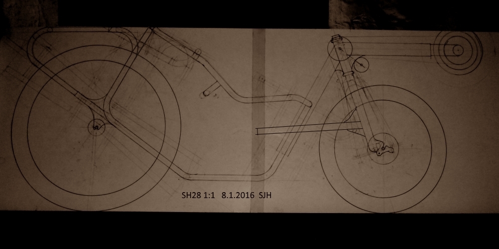 Ensi tiistaina alkavat taas hommat kansalaisopistolla. Putkien taivuttelun helpottamiseksi tein SH28:sta 1:1 piirroksen pahville. Valitettavasti ei kuvassa juuri näy poikittaisleikkaukset. Kaksoisrungon putket ovat 22 x 1,5 mm:n huonekaluputkea.