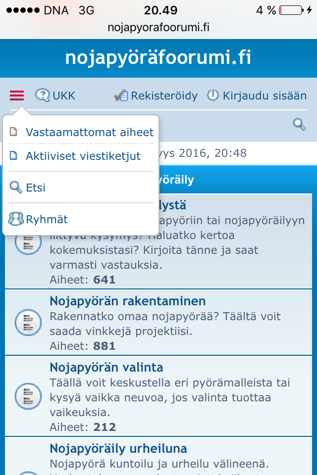 Puhelimen selaimella (safari) näkymä tämänkaltainen. Eli puuttuu oikeasta reunasta uudet viestit. Fillarifoorumilla samaa ongelmaa, mutta siellä saa valita "full site" toiminnon. Tästä en nyt sitä löydä :( ...