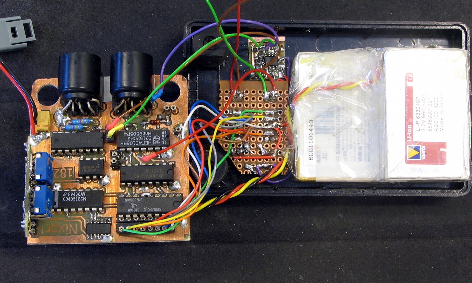 Sähkövaihtaja on melkein valmis. Parantelin alkuperäistä kytkentää hieman. Hienosäätöpotentiometrit otin pois, tilalla on vastukset ja 2 potentiometriä joilla säädetään pienin ja suurin vaihde kohdalleen. Moottorin indikaattoriledien herkkyyttä voi säätää 10mV- 5V. Helpotti testailua kun ei tarvinnu käyttää skooppia. Viron reissulla totesin että vaihtajaan pitää laittaa jonkinlainen iskunvaimennin ja jousi. Epätasaisella tiellä vaihtaja ei pysy paikallaan, ketju pomppii välillä ja akku tyhjenee turhaan. Leveämmät renkaat varmaan auttaisi myös vähän. Moottorin pieni ratas on pysynyt kiinni pelkällä pikaliimalla Se irtosi vasta kun asensin uutta ohjausyksikköä enkä rajoittanut moottorin tehoa ja säädöt eivät olleet vielä ihan kohdallaan. Näyttö on aika himmeä koska kirkkautta säätävä LDR-vastus ei sopinut koteloon. Virtakytkimen ruuvi on nyt siinä kohtaa. Kaikki osat mahtuivat ahtaaseen koteloon yllättävän hyvin. Kotelo ei ole vesitiivis eikä piirilevyssä ole vielä suojalakkaa. Tuossa saattaa aiheuttaa ongelmia myös musta kotelo joka kuumenee auringonpaisteessa, 70 astetta on mikropiireille yleensä maksimi.