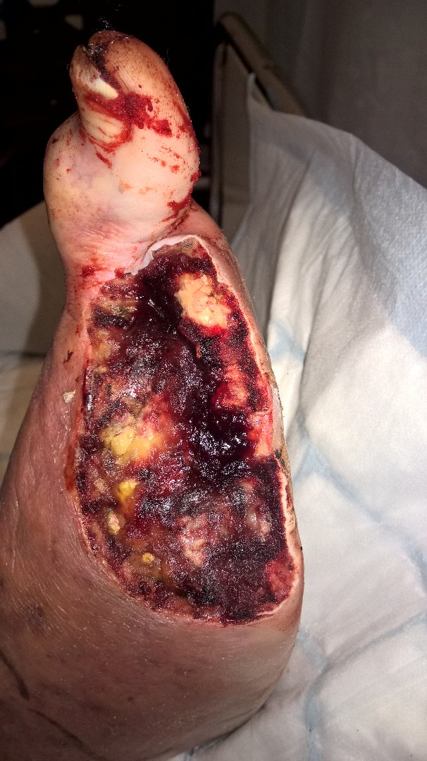 Aluksi olin ensiavun vuodeosastolla. Kun vatsakirurgian osastolla ei ollut tilaa, sain muuttaa sitten diabeetikkojen osastolle, jossa vietin muutaman vuorokauden ja sain konkreetisesti nähdä ja kuulla, mihin epäterveelliset elämän tavat ja -ravinto johtavat sokeritautisella. Jalat lähtevät pala palalta ja arpien korjaus on vaivalloista, joskus mahdotonta ja kivut aivan hirveät. Ohessa kuva naapurin jalkapohjasta. Viimein vapautui tilaa vatsakirurgian osatolta, joten muutinpa sitten sinne.