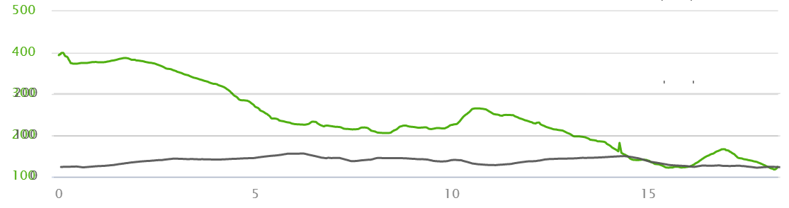 Tuo 110 kadenssin rajanopeus on tuossa kuvassa suunnilleen 200 m korkeusviivan kohdalla. Jokainen hetki, kun nopeus on tuon viivan yläpuolella, sinkula jää jälkeen. Niitä hetkiä on paljon, ehkä noin 80-90% koko matkasta.