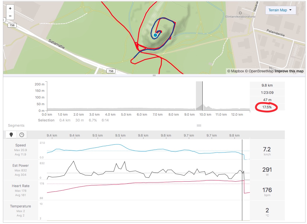 Kävin eilen ulkoiluttamassa Maxia Kokkolan maastopyöräreiteillä. Siellä on tosi hyviä polkuja heti keskustan tuntumassa. Sinne asti joutui mennä, koska täällä Kälviällä ei oikein ole kunnon maastopyöräreittejä. Tuollaisilla hyvillä poluilla on oikein miellyttävä ajaa ja Max pärjäsi oikein hyvin. Kokeilin myös mäennousukykyä ja kiipesin Patamäen päälle. Kyseessä on n. 30 metriä korkea jätemaasta kasattu mäki. Reitti mäen päälle on n. puoli kilometriä keskimäärin varmaan n. 7-8% nousua. Jyrkin kohta ennen huippua on Stravan mukaan 17,5%. Max kiipesi ilman ongelmia ja pitoa riitti huipulle asti.