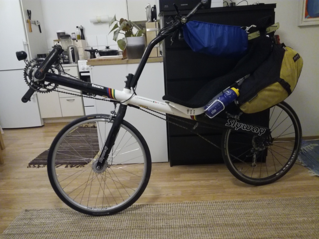 Pyörä on pakattu, kokonaiset 21.7kg plus ruoka/vesi. Kuskikin on tuhdissa kunnossa joten yli 100kg rullaa matkaan. Sääli takakiekkoa mukana on suurinpiirtein samat kamat kuin viime vuonna, nukkumavälineitä enemmän ja tietysti sininen ruokapussi.