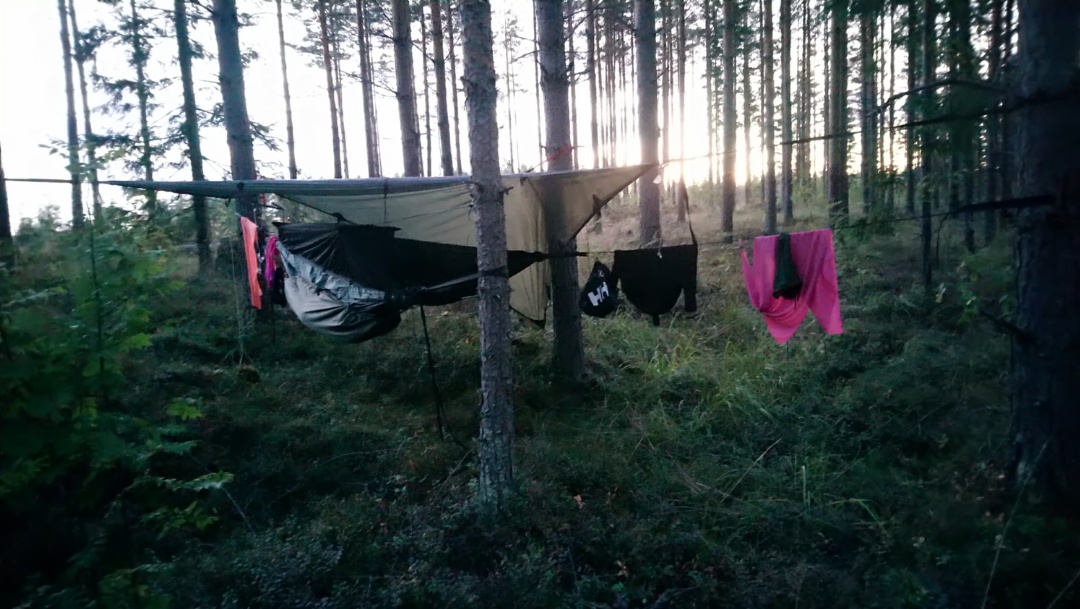 Matot puihin ja kun ei sada niin pilipali katosviritys. Märät kamppeet kuivumaan ja viimeisillä valonsäteillä hotellikuvat muistiin ja hämärtyvässä illassa ruokaa ääntä kohti. Kun pimeys tuli niin vetäydyimme mattoihin. Vähän pähkittiin tästä seuraavaa yötä, sääennustetta ja lakana vaihtoehtoa suihkuineen mutta annettiin huomisen päättää.