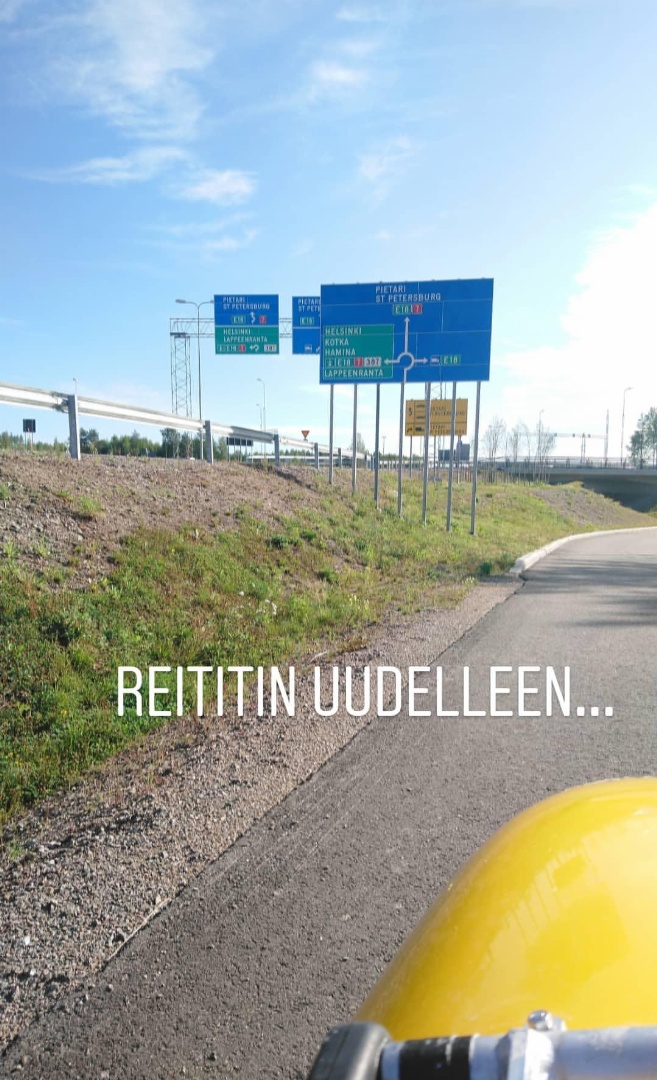 Hetki meni kun pääsimme keskustasta pois, pyöräteihin leipäännyin ja hetkeksi menimme ajoradalle kunnes vaalimaantie tuli eteen ja takaisin pyörätielle. Pikkuvauhtimutka omakotitaloalueella kun väylä huiteli mihin sattuu ja takaisin maantienvarteen. Kyltit ois kivoja… Vaan ihan joutuisaa ajaa maantiellä, tie taas vei vaikka silmille ei niin paljoa ärsykkeitä ollut. Helppo valtatie.