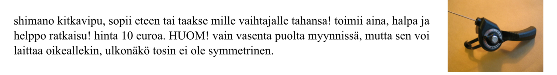 Kiitoksia kuvista ja vinkeistä vaihtajan vipuihin liittyen! Trigger olisi minulle eniten mieleen, mutta tosi ahtaaksi käy tanko jos laittaa sekä etu- että takavivut. Ehkä ne jotenkin saisi sopimaan, mutta ote ei ole sitten enää kovin kohdallaan niihin. Saukin QV:n pystyputken tapaisen voisi tehdä takavaihtajan vivulle jos siirtäisi töötin nappulan toiseen kohtaan. Eturattaan tietysti voisi jättää gripshiftille, mutta sitäkin tulee käytettyä paljon. Vilijamin tangonpään vipuja olen kanssa miettinyt. Ne olisi helppo asentaa eikä tulisi tanko ahtaaksi. En tiedä oppisiko pelkällä kitkavivulla vaihtamaan oikein? Mutta näitä saa indeksoitunakin, joten sellaista voisi myös miettiä tähän ratkaisuksi.