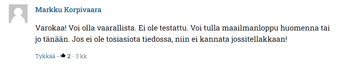 Mihin me tarvitaan ruokavirastoa, jonka asiantuntemus ja tarmokkuus on sitä tasoa, että pelotellaan varmuuden vuoksi. Kyllähän tuon pelottelun osaa jokainen muukin mummo. Pelottelu ilman perusteita ilman parempaa tietoa on jokaisen helppo tehdä itse. Tutkimus ei ole.
