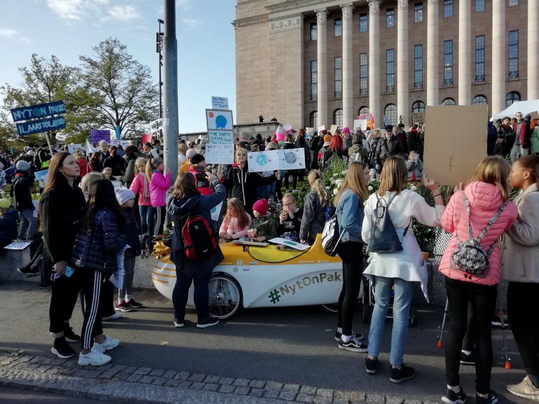 Polkeminen Helsinkiin sujui mukavasti yhtä rengasrikkoa lukuunottamatta. Mielenosoituksessa tunnelma oli innostunut ja nuoret ihmiset puhuivat rohkeasti monituhantiselle yleisölle.