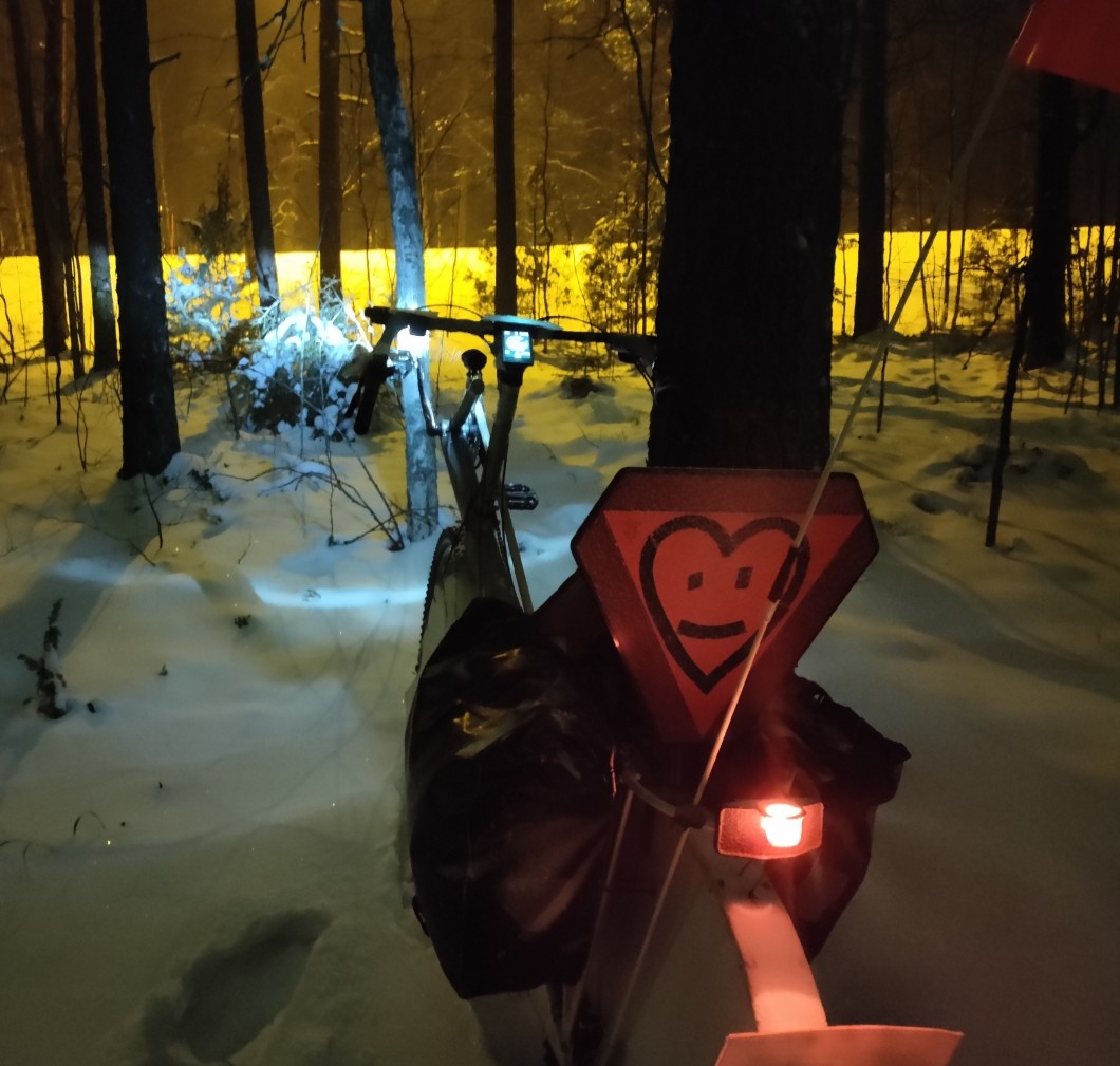 Oli tuossa autotien lumet aurattu jo muutenkin auraamattomalle pyörätielle ja vaikka annoin napista täyden kilowatin sähköä niin pyörä eteni alle kävelyvauhtia ja lopulta hyytyi kokonaan, ja varaus näytti 0%, kun 200m aiemmin oli vielä 20%. Siinä taluttaessa prosentit kuitenkin nousivat takaisin noin viiteentoista.