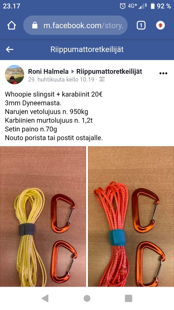 Ostin Varustelekasta tunkiosta rikkinäiset DD:n Whoopie slingsit eurolla. Toinen oli rikki saatu. ^_^ Ostin tosin myös 10,5 metriä 2,5mm dyneemanarua. Eiköhän noilla saa riiputtua. Lisäksi kofeiinisuklaata. Sunnuntaina kokeilemaan jonnekin.