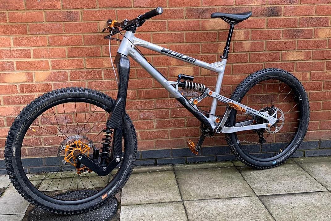 Jousitusta kaipaisin talvipyörään, tällaiseen SWB-malliin taakse ja myös eteen. Sen pitäisi kyllä olla kumijousitus tms. huoltovapaa viritys. Taakse helppo toteuttaa, mutta eteen pitäisi kai tehdä jokin linkusto teleskooppihaarukan sijaan, jos kumilla meinaisi jousittaa. Tähän tyyliin: