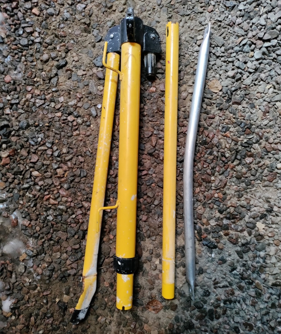 Dyykkasin roskiksesta jonkinlaisen kolmijalan, josta sai valmiiksi lähes millilleen oikean mittaiset uudet selkänojan tukiputket. Entiset ovat aika mutkalla kaatumisista, kun sivulaukku painaa tuohon. Alkoi kuumottaa noiden tukien pettäminen, kun tarakka nyt petti.