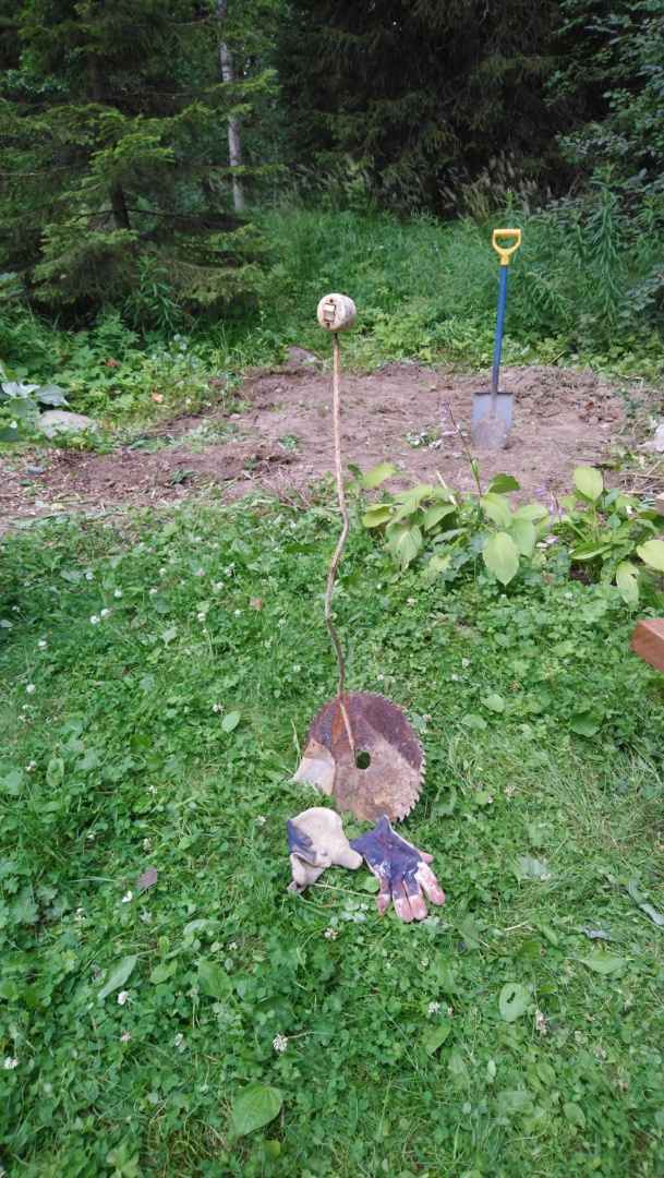Tämän väkersin kun kasvihuoneenpaikkaa kaivellessa löytyi taas vähän kaikkea materiaalia maanalta. Tosin punaläikikkäät hanskat otin uudelleen käyttöön vaikka ne mielestäni sirkkelinterän kanssa passaa hyvin yksiin.