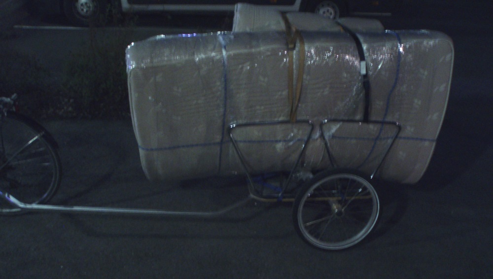 Täytyy kyllä myöntää että nuo eivät olleet hurjimpia virityksiä, niistä hurjimmista en edes ottanut kuvia. Mies veti keskimäärin painavempia lasteja kuin minä, koska sillä on pyörässä parempi kiinnitys kärryyn kuin itselläni. Suurimmat lastit vielä vedettiin ison tien yli valoristeyksestä, koska niitä olisi ollut ihan turha lähteä taittamaan alikulkutunneliin. Kaverin naapuri oli bongannut meidät kun vedettiin kauniina sunnuntaina noita sänkyjä perässä :D .