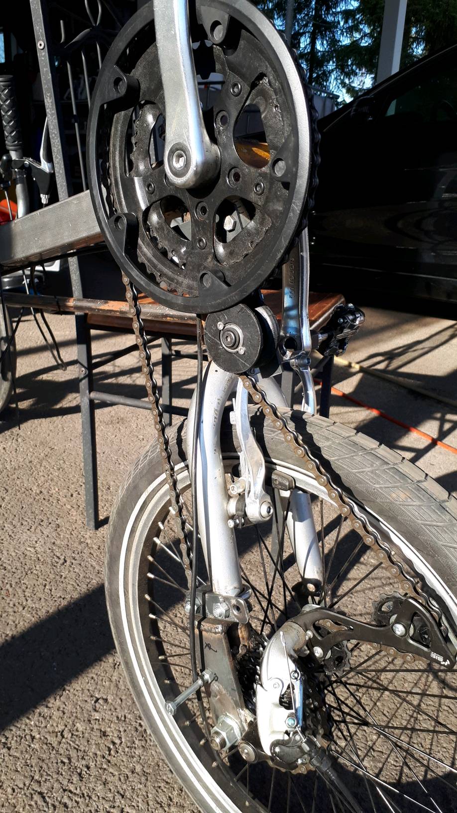 Twisteri heräsi talviuniltaan ja muistin oitis ongelmakohdan joka on pitänyt korjata. Pyörää jos pukkaa taaksepäin ohjauksen ollessa vähänkään käännettynä, niin ketju hyppää pois paikaltaan. Syynä on rullaluistimen renkaasta tehty taittopyörä, terävät sisäreunat ja kuminen materiaali. Ketju haukkaa mielellään kumin laitaan kiinni ja nousee urastaan.
