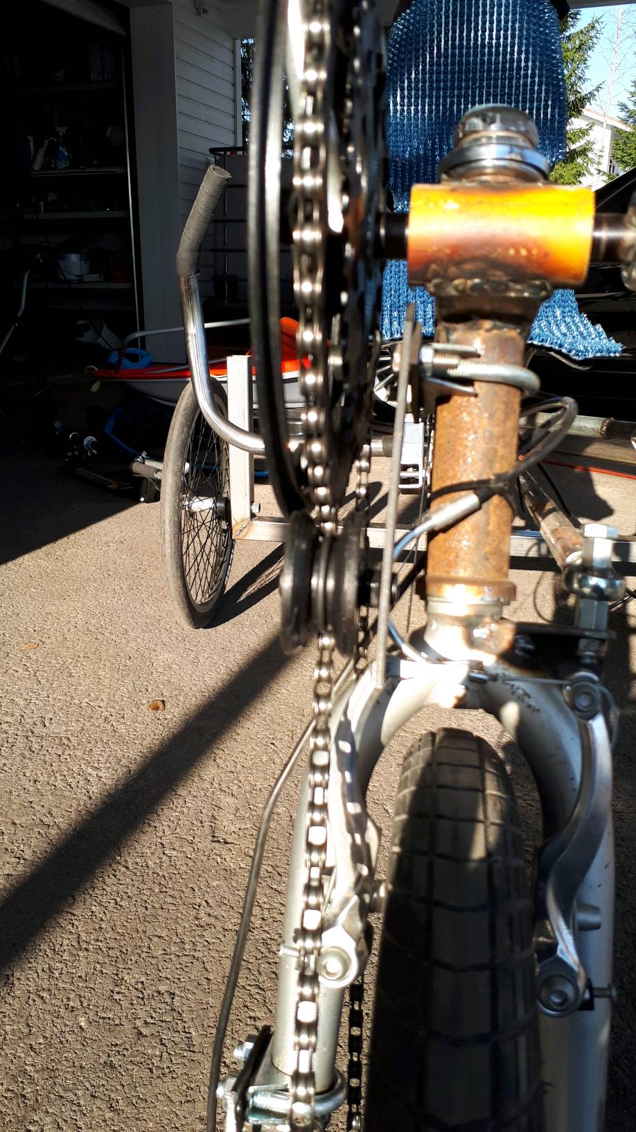 Uusi taittopyörä on pienempi kuin entinen, joten sain siirrettyä sitä vähän taaemmas, niin ohjaus mahtuu kääntymään enemmän kuin ennen.