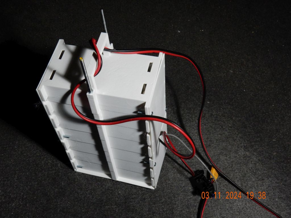 Sain kasattua 15 EVE C40 akkua sarjaan käyttämällä 3d printattuja neliskanttisia muovin palasia. Sähköliitännät sai tehtyä akkujen mukana tulleilla "bus bar" läpysköillä. Ajattelin ympäröidä paketin solukumista tehdyllä "taskulla", kantamiseen muovikassi, ja "asennus" sivulaukkuun.