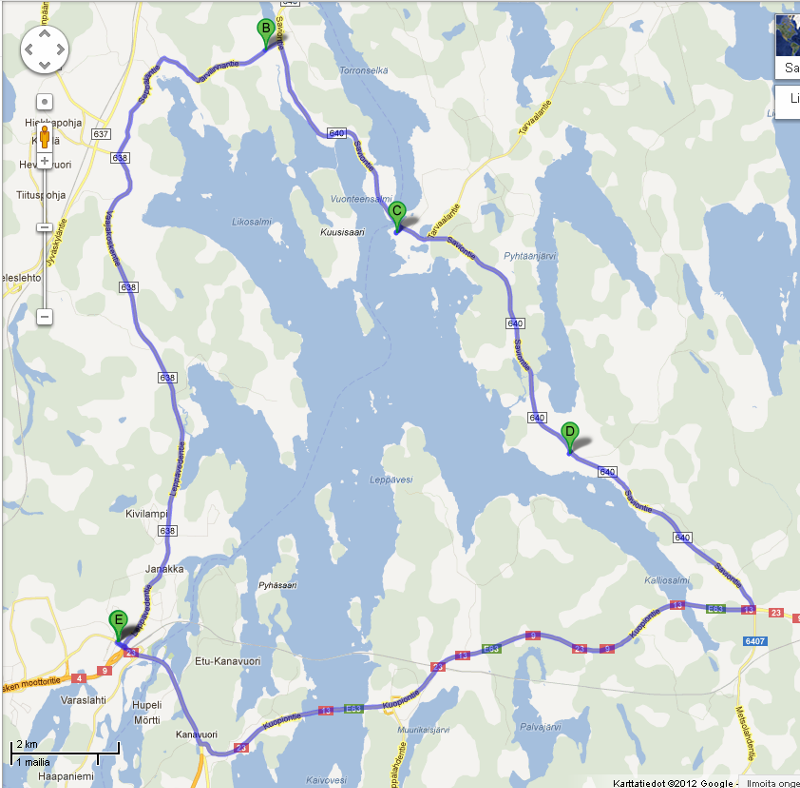 Keli oli mukavan vaihteleva, varsinaisesti rupesi satamaan juuri, kun olin tullut kotiin. Noin 13 km:n matkan jouduin ajamaan ysitien sunnuntain paluuliikenteen seassa. Tuon osuuden hulppeissa alamäissä jäi huippunopeus 50 km/h, kun liikenne oli kovin vilkasta. Kun tuollaisessa nopeudessa hurahtaa vierestä rekka ja peräpyörteet rupeaa nojakkia heivautteleen, kyllä siinä jarruja rupeaa paineleen. Muuten täytyy sanoa, että ysitien pientareet ennen Vaajakoskea ovat esimerkillisiä, riittävän leveitä eikä hammastuksista ole tietoakaan.