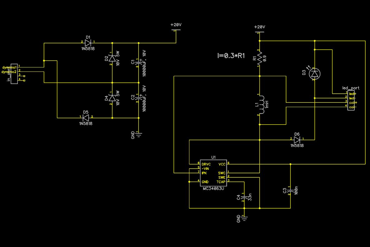 Prosessorin käyttäminen tuntuu menevän aika hankalaksi kun virtaa pitäisi siirrellä eri suuntiin riippuen superkonkan lataustilanteesta ja dynamon toiminnasta. Toisaalta MC34063 hakkuripiirin virran säätäminen ts. valon kirkkauden säätäminen menee hankalaksi kun 1 ohmin säätövastuksia ei taida löytyä kaupasta, ei ainakaan halpoja. Siis prosessori voisi säätää kirkkautta ja lukea tavallisen potikan asentoa.