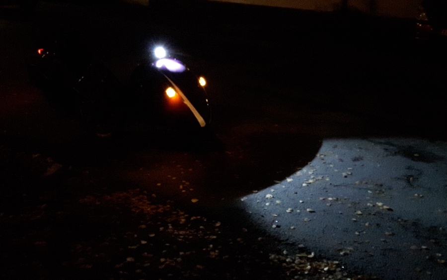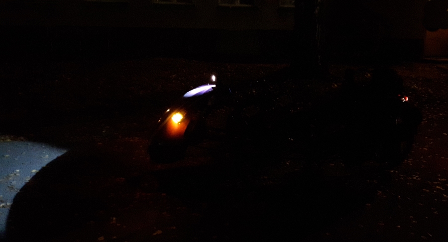 On aika tehokkaat nuo nykyiset ajovalot. Ihan hyvin näkee ihan pilkko pimeässäkin. Ja näköjään oli ihan hyvä idea ostaa kylkiin nuo lisä-heijastin tarrat. Yllättävän hyvin näkyy tuo pieni takavalokin. No se nyt ei ole tietysti mikään ihme, että se noin pimeässä näkyy kauas. Päivänvalossahan se ei varmaan kauas näy.