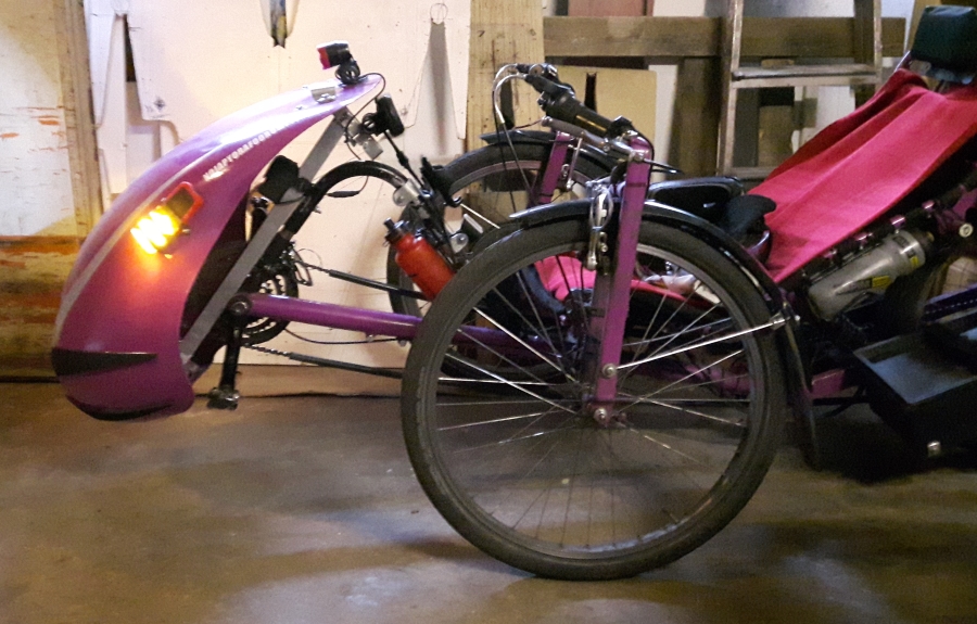 Laitoin MC34063 hakkurikytkennän pyörään kiinni. 1.5L limupullo sai toimia kotelona, leikkasin keskeltä auki, "laiva" sisään, johdot pullon suusta ulos, ja pullon puolikkaat menee kiinni aika siististi sisäkkäin. Jonkunlainen panta pitäisi kai laittaa kiinnikkeeksi, nyt pelkästään painovoiman ja maalarinteipin varassa.