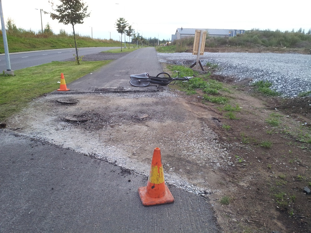 Miksiköhän en huomannut vaaran paikkaa, olinkohan ajatuksissani vai tottunut siihen että vaikka pyörätie katkeaa välillä eri värisenä niin yli pääsee aina...