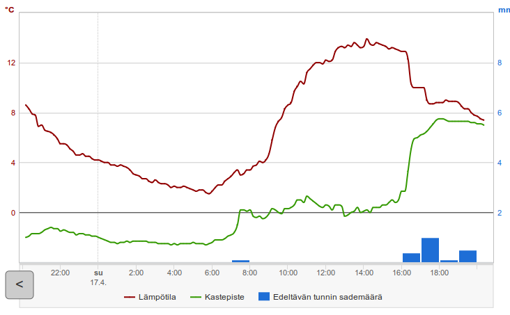 Aika petollinen ilma lihasten kannalta. Aurinko paistaa ja mittarin mittaama lämpötila on jopa 13 astetta, mutta märkälämpötila, eli kastepiste, eli hikisen ihon kohtaama lämpötila on nollan tienoilla. Ei ihme, jos alkoi kolottaa. –Onhan takapyörien auraus tarkastettu? :)
