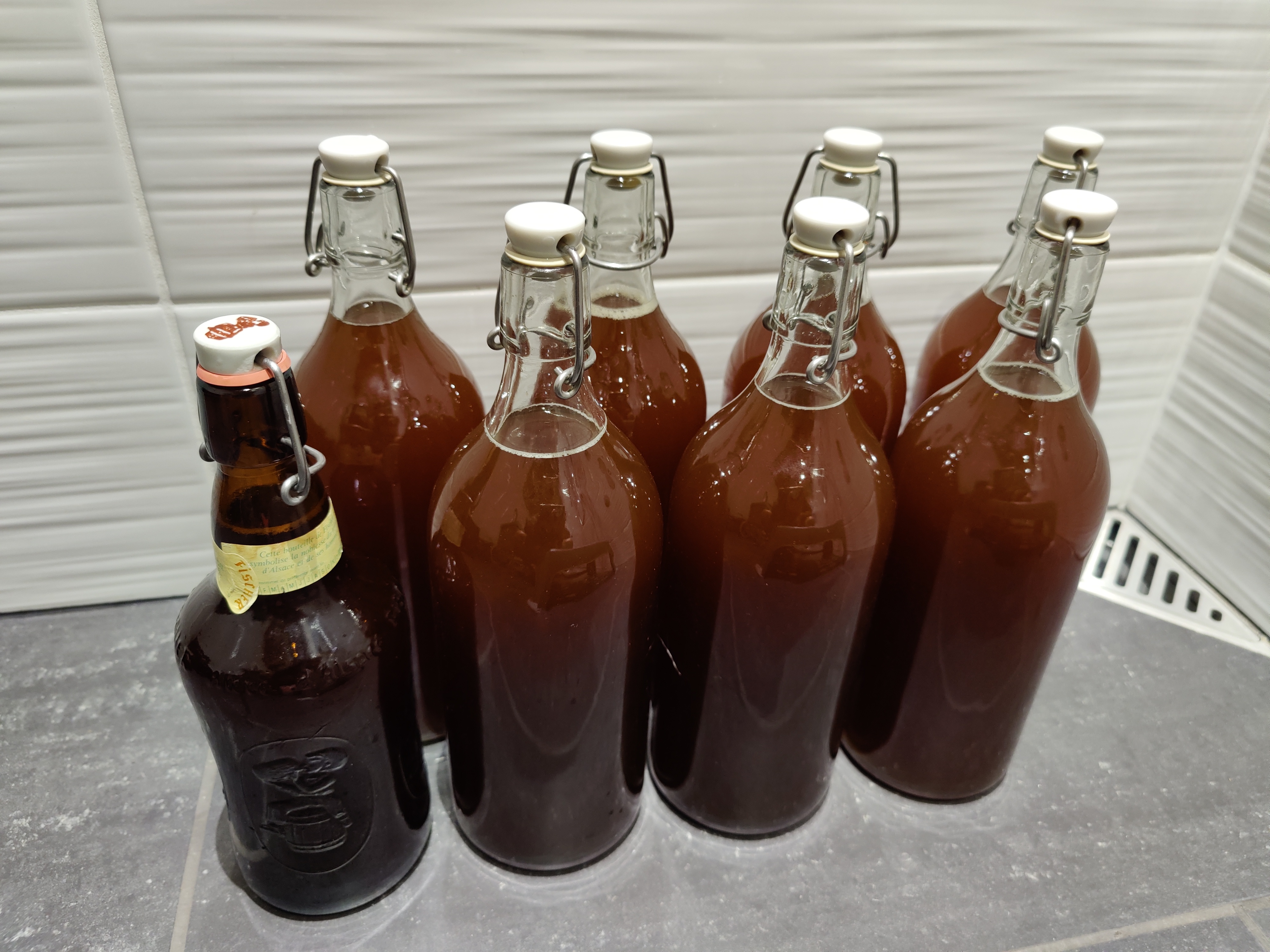 Nyt laitoin kylmäuutetun kombuchan hapottumaan 8g jälkikäyntisokeria ja 0,5ml kuivahiivaa per litran pullo.