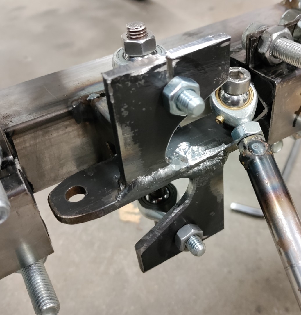 Tein vaan. Nyt testailen säätöjä hyväksi käyttäen, millä kulmilla vekotin rullaisi parhaiten. Jos se nyt näillä säädöillä onnistuu. Ohjausvarret yhdistävän kolmion muotoa voi vähän säätää, samoin olkavarsien päissä vipuvarsien kulmaa, jonka sopivan kulman löydyttyä hitsaan paikalleen.