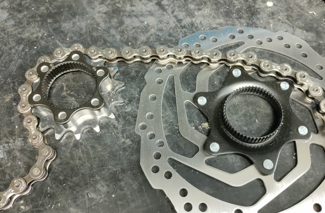 Pitäisi keksiä miten centerlock-kiinnitykseen saa kaksi ratasta rinnan. Centerlock-6-pultti-adapterille saa hädin tuskin yhden paksun rattaan, koska se on suunniteltu yhdelle jarrulevylle, joka on ohuempi. Lukkorengasta ei saa paikoilleen paksummalla paketilla. Ketju myös osuu adapterin sakaroihin. Pitänee siirtyä isompiin rattaisiin ja käyttää kiinnittämiseen tuota jarrulevyn teräksistä centerlock-palikkaa.