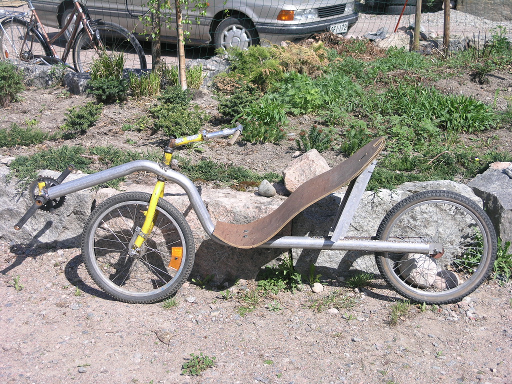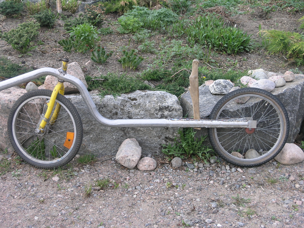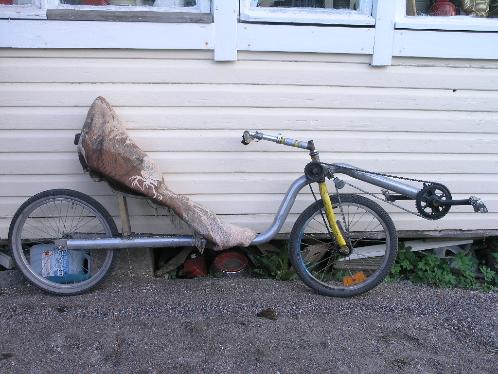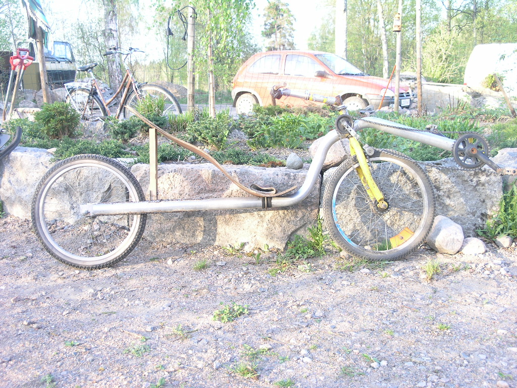 Akseliväli on 1250mm , istumakorkeus 310mm ja poljinkeskiön korkeus 470mm. Akseliväliä vois varmaan lyhentää tuo 20" rengas mahtuis hiukan eteenpäin haarukkaa levittämättä. Osat on lastenpyörän osia , poljinkammet on 150mm eli vähän edellistä versiota lyhyemmät. Eturataskin on pienempi , ehkä tuohon saa toisen liitettyä jotenkin viereen. Testilenkin kävin heittämässä ns, Vuoksenlenkki noin 6 km ja sen verran innoissani olin ett pulahdin lenkin jälkeen Vuoksessa uimassa. Virkistävää kuulemma 8 astetta. Hyvin toimi , tosin penkki ei oo mitenkään kohallaan. Se on ensimmäinen vaneripenkki jonka kokeilin liimata kasaan mutt muoto ei oikeen sattunu kohalleen ja nyt se on vielä asennettu toisin päin kun alunperin oli tarkoitus. Jos tekis vanerista penkin jossa ei olis ristiseläntukea kiinteenä ollenkaan ja laittas siihen sitten irtonaisen ristiseläntuen niin että se vois liukua tarpeenmukaan, toimisko tuo ?