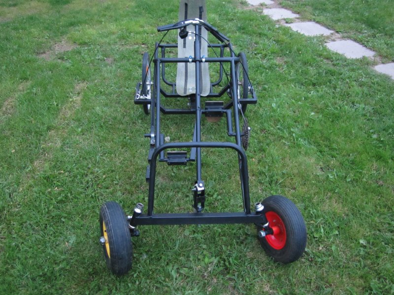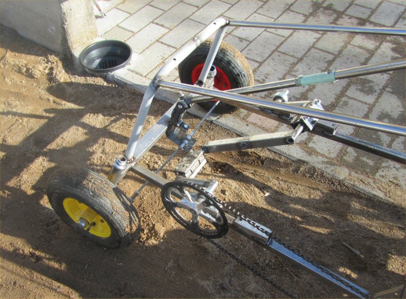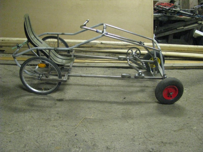 "Kun sain ohjauksen tehtyä niin piti rakentelumotivaation ylläpitämiseksi laittaa vielä ketjutkin niin pääsi vähän ajamaan. Parantelua vaatii moni paikka, mutta perusidea tuntuu toimivalta. kiinnitin huomiota etenkin ohjaukseen, omatekemät ristinivelet toimivat yllättävän hyvin. Ohjauksen välitys on turhan nopea (1:1), tanko pitäisi kääntyä vähemmän pyöriin nähden. Nyt muuttaa suuntaa hyvin pienellä liikkeellä. Käytiin vaa-alla, 30 kg ja muutama lisää tulee vielä."