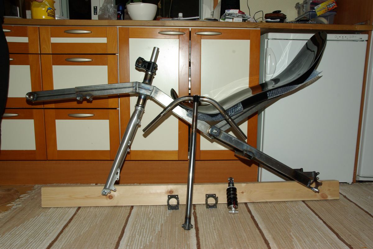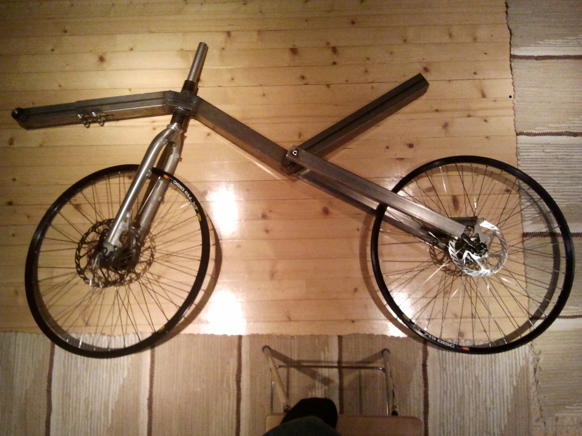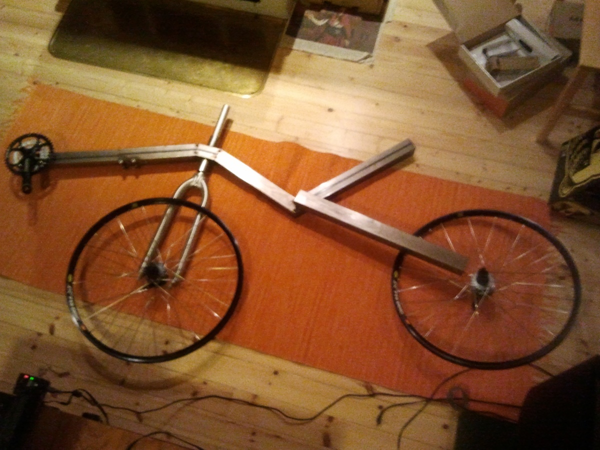 Runko on nyt varsin hyvä, jalat yltää kunnolla maahan penkillä röhnöttäessä. Ketjulinja ei valitettavasti kulje suoraan tälä taivutetullakaan haarukalla vaan rissa on laitettava. Jos jollain on joutilaana vetopuolelle sopiva (hampaallinen, miel. kaksi laakeria?) rissa niin voisin huolia.
