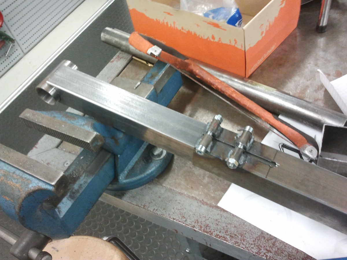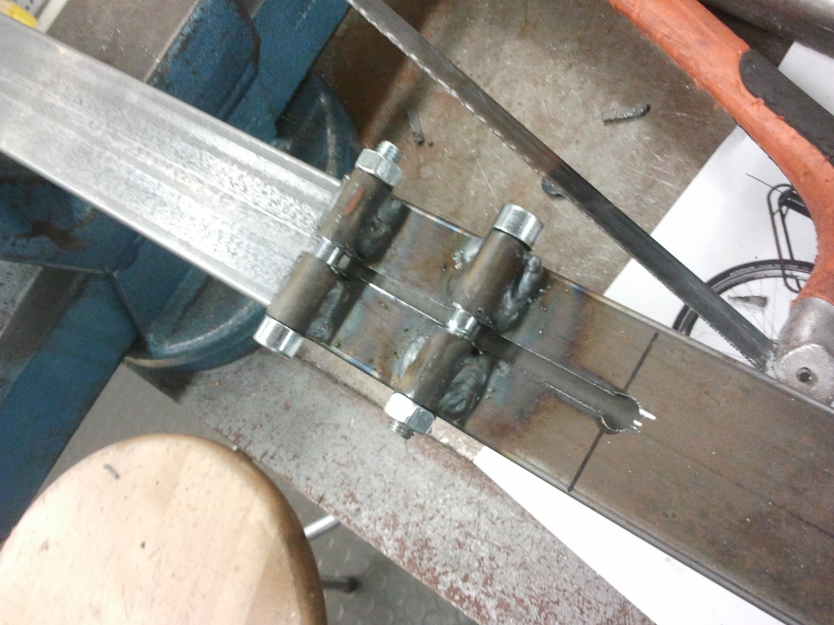 Kuva muomin jatkomekanismista. Hitsasin runkoputken kylkeen kaksi pätkää 12x2 mm hydrauliputkea ja halkaisin koko höskän. Putkeen menee 8mm pultit, mikä voi olla vähän liiottalua, mutta tällä mennään.