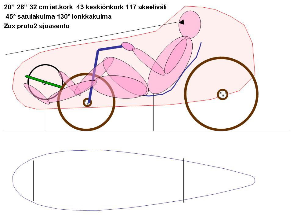 Masennuksesta selvittyäni mietin asiaa ja lähdin rakentamaan uutta teräsprotoa, tällä kertaa normaallimmalla ja konservatiivisemmalla ajoasennolla. Pohjaksi otin vanhan Zox 20 Z runkoni, siitä on aikanaan keskiötä alennettu 8 cm, värkkäsin uuden, korkeamman takapään. Mitoiksi tuli istunkorkeus n.32 cm, keskiö n.43 cm, akseliväli 117 cm lonkkakulma 130 ja istuinkulma 45. Takajousitus on samankaltaine kuin Zoxissa, kumipötkylä vaimentimena. Heitin keulaan vielä M5:n etukopan, kuvaa varten teippasin ulkopuolelle kammet niin näkyy missä ne ovat (kuva: Cone 2 Zox proto1). Ajettu on vasta 2 km, hyvin meni, mutta tarvitsen lisää kilometrejä jotta ergonomiasta voi lopullisen totuuden kertoa. Ainakin ajoasento on pysty, polvet ja kädet kopan takana ja näkee hyvin etukopan yli. Ajatus olisi tehdä tästä streamlineri päällystamällä proto makuualustalla ja katsoa saavutanko nopeustavoitteen jo tässa vaiheessa.