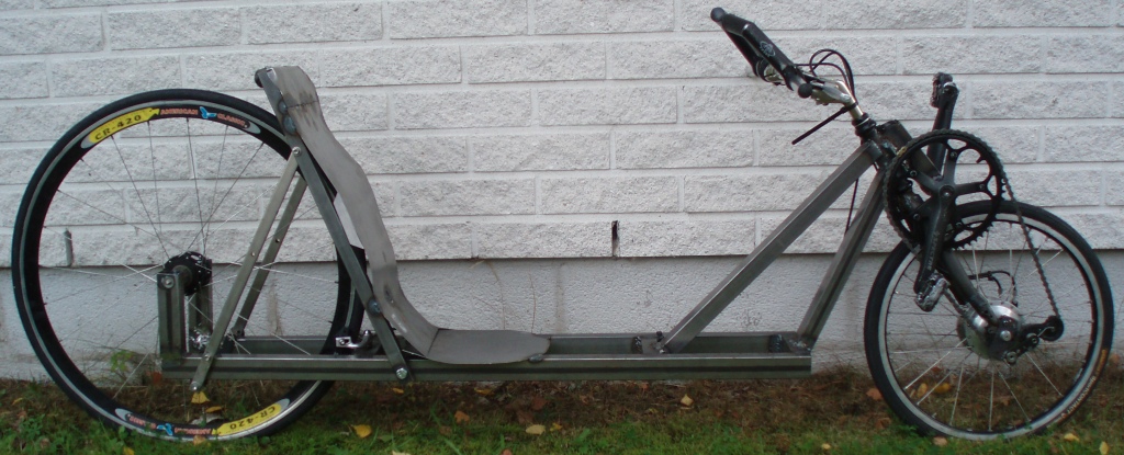 ensimmäinen teräsproton suoralla etuvedolla jouduin raskain sydämmin laittamaan luokkaan huono idea, ei toimi ajoasento. vähensin lonkkakulmaa (Kuva: cone1 teräsproto 4) ja sain ajettavan pyörän, mutta polveni kipeytyivät jo 10 km testiajossa. se on se kulma polvessa/lonkassa liian pieni, eli polvet tulevat liian lähelle rintaa, masentavaa . pyörä sinänsä toimi muuten hyvin.
