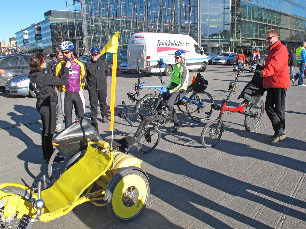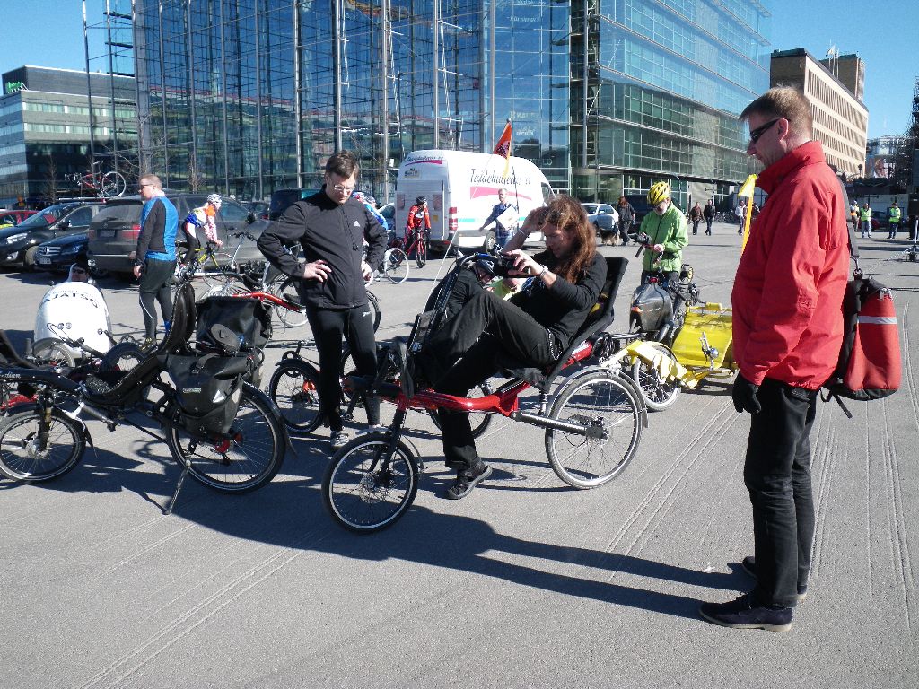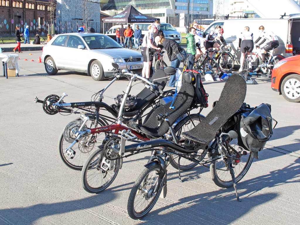 Tosiaan päivän valikoituminen ei olisi voinut mennä paremmin, sillä sää suosi toden teolla ja paikalla oli varmasti maksimimäärä pyöräilystä kiinnostuneita, koska samalla musiikkitalon takapihalla oli naisten pyöräilykilpailut. Muutamia nojapyöräilijöitä kävi joku täti mikin kanssa haastattelemassa. Hyviä puheenvuoroja kaikki. :)