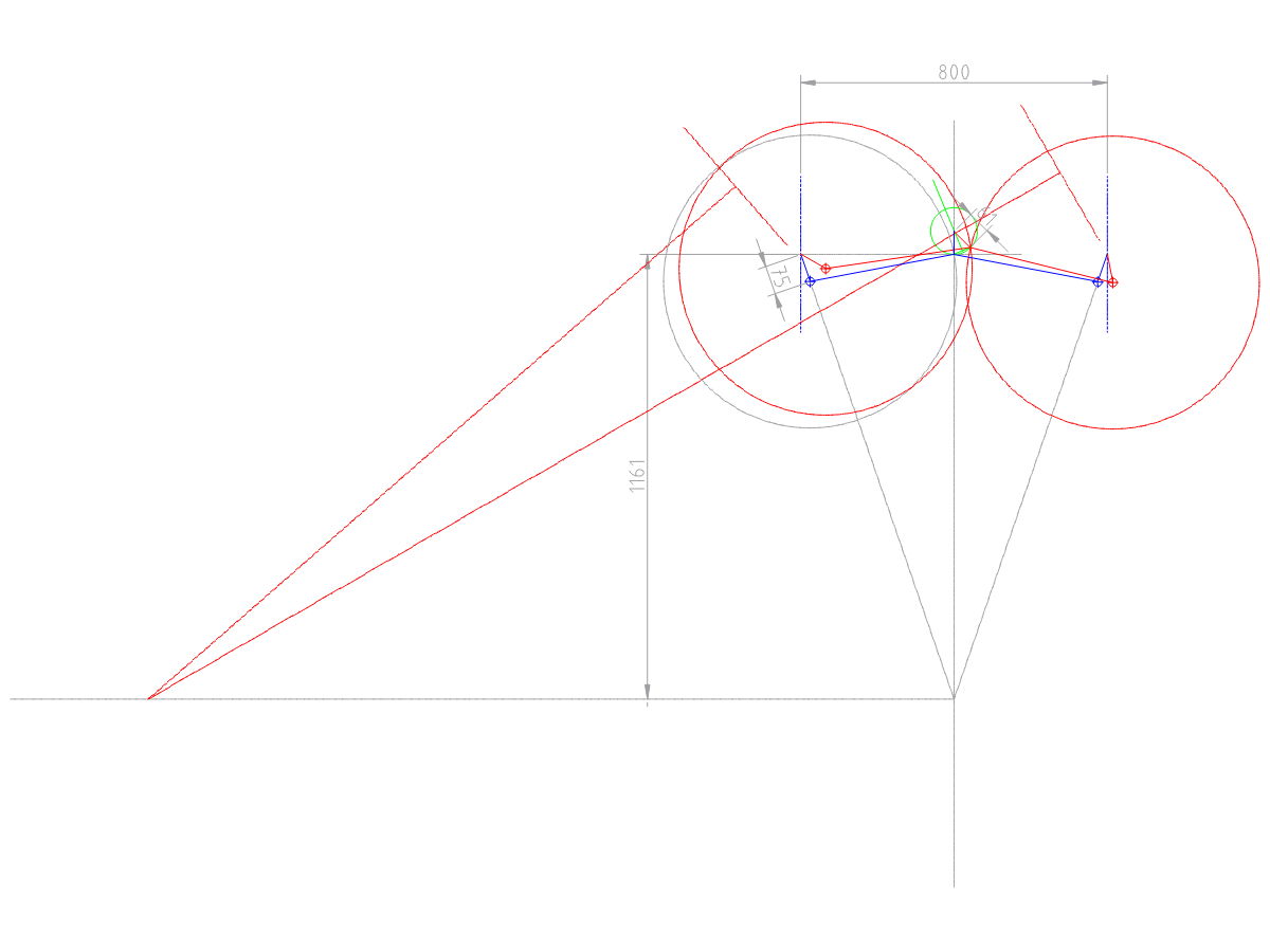 vph kirjoitti:Harrastin nyt iltasella tasogeometriaa viivoilla ja ympyröillä ja selvitin ohjausvipujen ja -tankojen pituudet piiruspöydällä. Mielestäni viisaampi tapa kuin "normiarvonta" eli ackermanin arpominen useita reikiä poraamalla. Laitan kuvan tähän, en tiedä jaksaako siitä seuraamaan piirtämisen logiikkaa, mutta "ratkaisu" tuossa on tuo 44 mm keskitangon pituus. Ohjauksen paikka (50 mm) ja sivuvipujen pituus (73 mm) oli ensin päätetty visuaalisesti sopiviksi. Käsittääkseni tuossa tulisi ohjauksen mekaanista tehostusta noin 1.66 x.