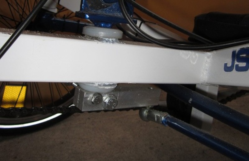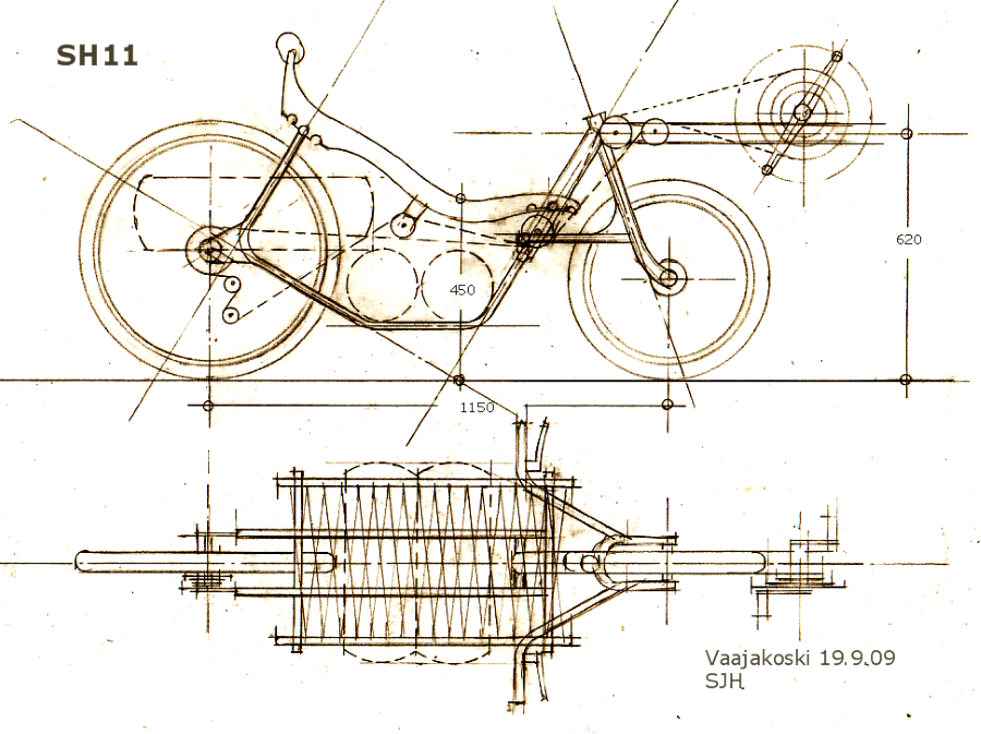 Olen tässä pähkäillyt miltä (vaakatasossa) taitettu raidetanko näyttäisi, ja miten päin keskellä oleva vipuvarsi pitäisi asettaa, että taitoksesta tulisi mahdollisimman vähän haittaa. Kuvassa mustilla viivoilla piirretty ehdotus. Vai voisivatko raidetangon osat olla samassa vertikaalitasossa nivel keskellä?