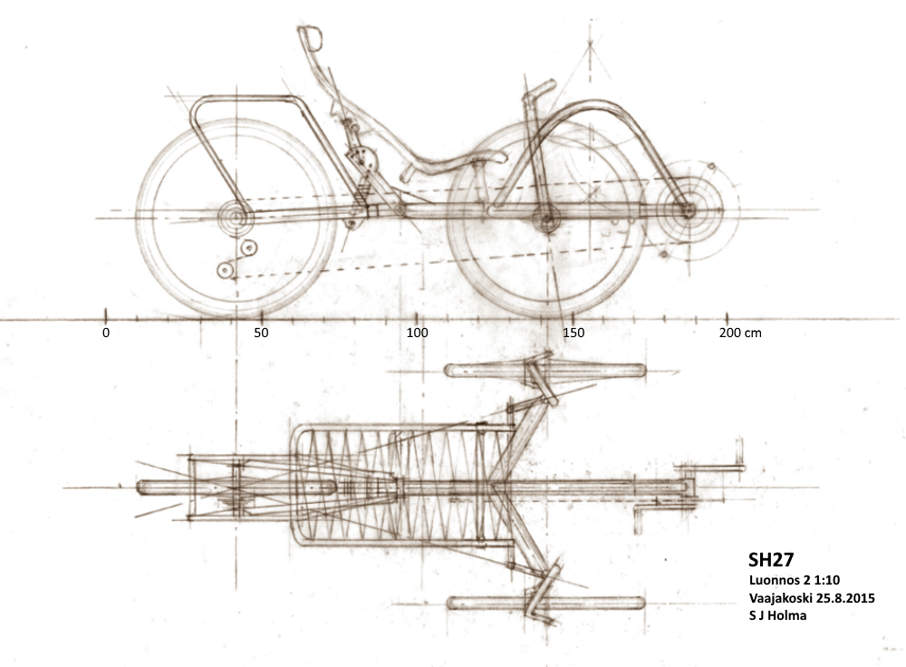 Jos kuvaa napsauttaa, näkyy piirustus 1:10 skaalassa. Tarakkaan tulee vielä vinorevat tekemään sitä tukevammaksi. Tarakka ja etukaari ovat alumiiniputkea.
