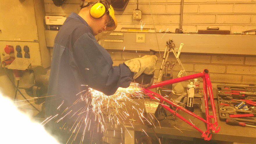Luovuttajapyörän emäputki oli hitsauskelvottoman ohutta, joten tehtiin uusi 38x2-putkesta.