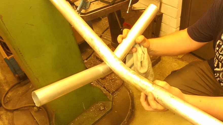 Putkentaivutin on Samuelin. Se on vain lainassa. Putki alumiiniputki saatiin taipumaan, mutta vaati aika paljon työtä. Ensin lämmitimme putken pehmeäksi ja vielä taivutuksen aikanakin puhaltelimme kuumaa päälle. 3/4 tuuman lesti on juuri sopiva 50 mm putkelle. ![]()