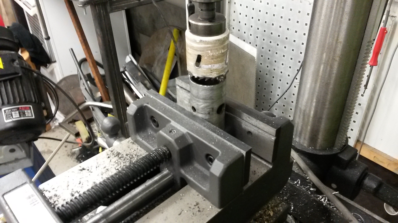 Keskiömuhvin irrotus rungosta on kovaa ja epäkiitollista puuhaa. Tällä kertaa päätin kokeilla 44mm reikäsahaa. Kohtuu vaivalla runkoputket irtosivat. Muhvin halkaisijaksi tuli noin 39,5mm. Kaippa se vielä hitsausta kestää?