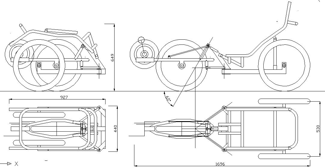 Katselin, että olit tehnyt vartavasten suurille kääntökulmille kykenevän rakenteen koukkaamall etuhaarukan ylös ja sieltä yhdellä putkella ohjauslaakerimuhvin kylkeen. Haarukan sivujen kiinnittäminen suoraan laakerimuhvin kylkiin raoittaa ohjauskulmaa.