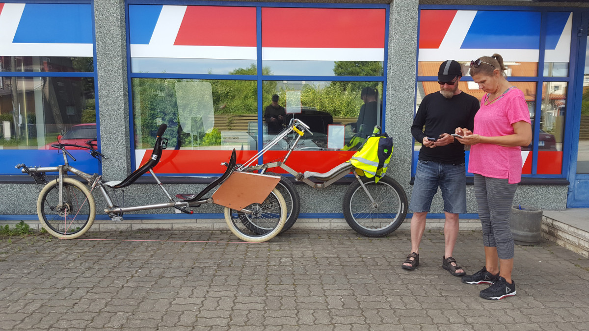 Muistelen ottaneeni kuvan tuosta tandemista Ecotripin ensimmäisen yöpaikan pihalla aamulla ennen lähtöä, muttei kuvaa löytynytkään puhelimesta. :( Onkos sinulla Pastori itselläsi parempaa kuvaa kuin tämä, jossa huolestuneet ilmeet kertovat huoltoauton huolista.